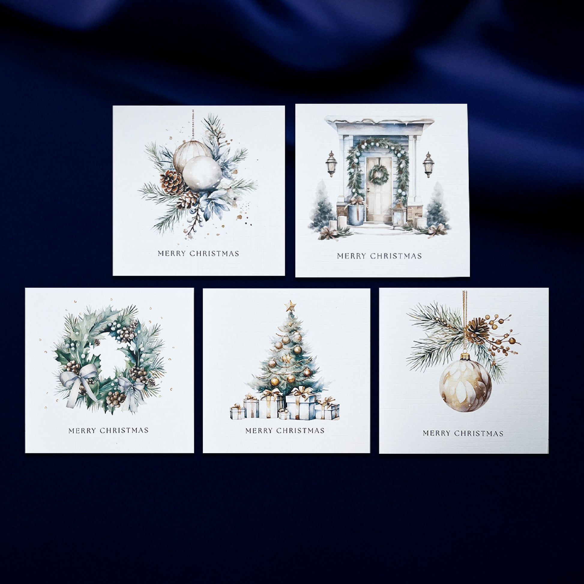 Our 5 pack Cool Winter Collection cards are perfect for sharing your warm Christmas wishes. Each card features a beautiful watercolour design.